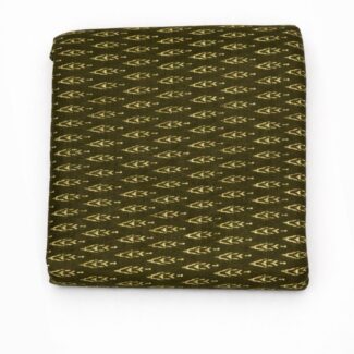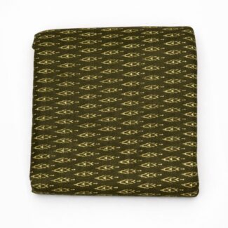 This fabric features a rich olive green base adorned with small, repeating geometric arrow-like motifs in a soft beige tone. The pattern is neatly arranged, giving it a clean and elegant look with a subtle traditional touch. The color combination is earthy and soothing, making it perfect for both casual and semi-formal wear.
