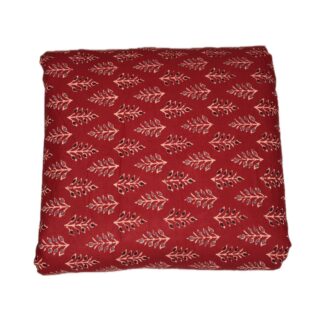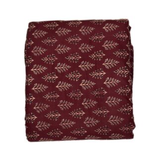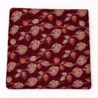 This fabric features a deep maroon base adorned with an elegant, repeating buta (leafy sprig) motif