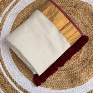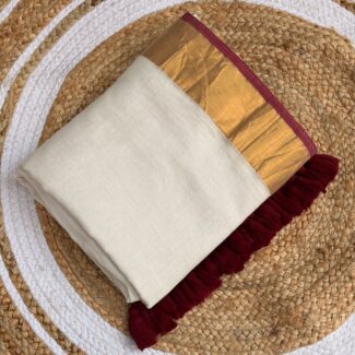 saree border the saree is framed by a rich wide antique gold zari border handmade tasssels one of the standout features is the heavy maroon tassel work along the edge of the pallu