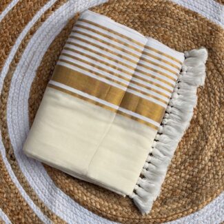 The saree is crafted from a premium Mul Cotton or Fine Cotton fabric. It features a soft, breathable texture with a subtle translucent quality, making it ideal for comfortable, all-day wear. The ivory-white base offers a clean and refreshing aesthetic The most striking feature is the horizontal striped pattern on the pallu. It consists of alternating bands of rich antique gold zari and thinner metallic stripes, creating a rhythmic and contemporary visual appeal