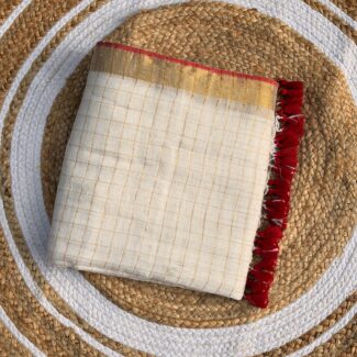 This elegant handloom saree features a classic off-white (cream) base, crafted from a breathable, lightweight fabric that offers a graceful drape A fine-textured weave (resembling Mul Cotton or a light cotton blend) that provides both comfort and a sophisticated matte finish.