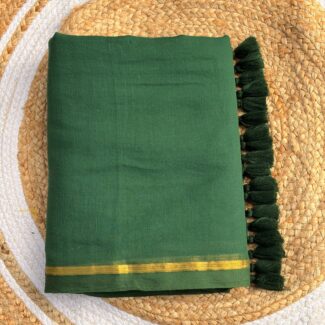 This beautiful saree combines earthy textures with a sophisticated, deep forest green hue, making it a versatile choice for both casual gatherings and festive occasions.