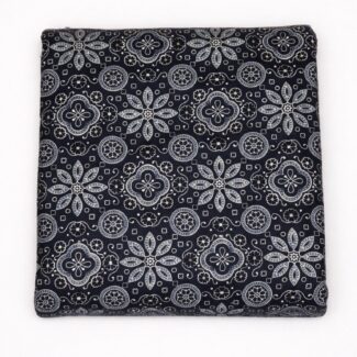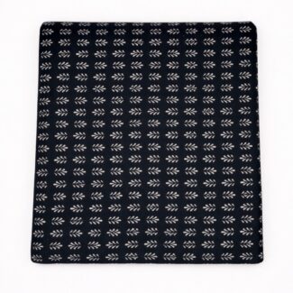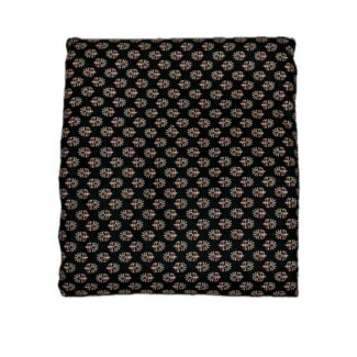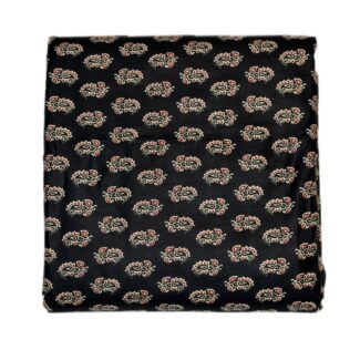 This fabric features the sophisticated artistry of Ajrakh hand-block printing on a deep, classic black base