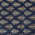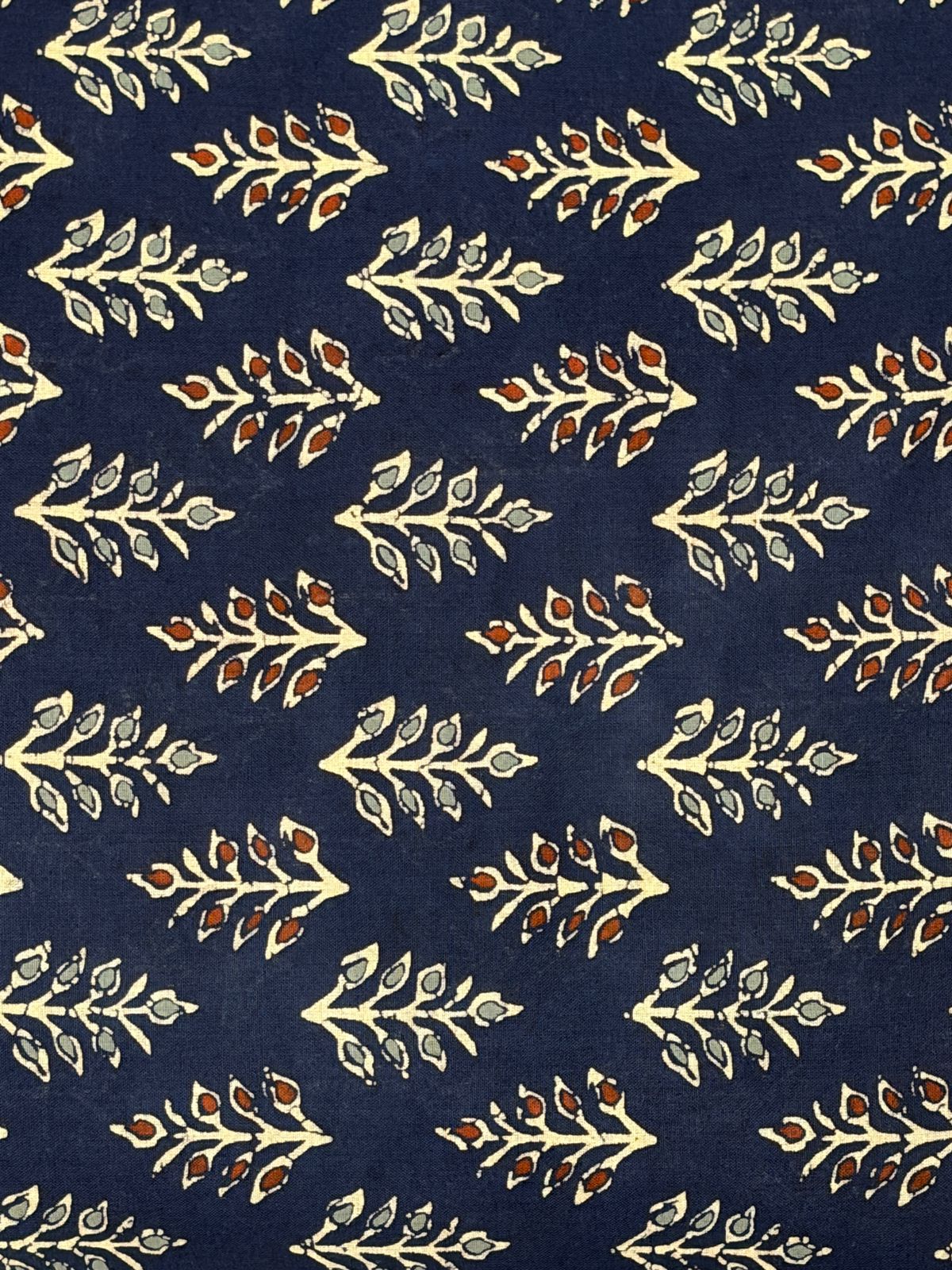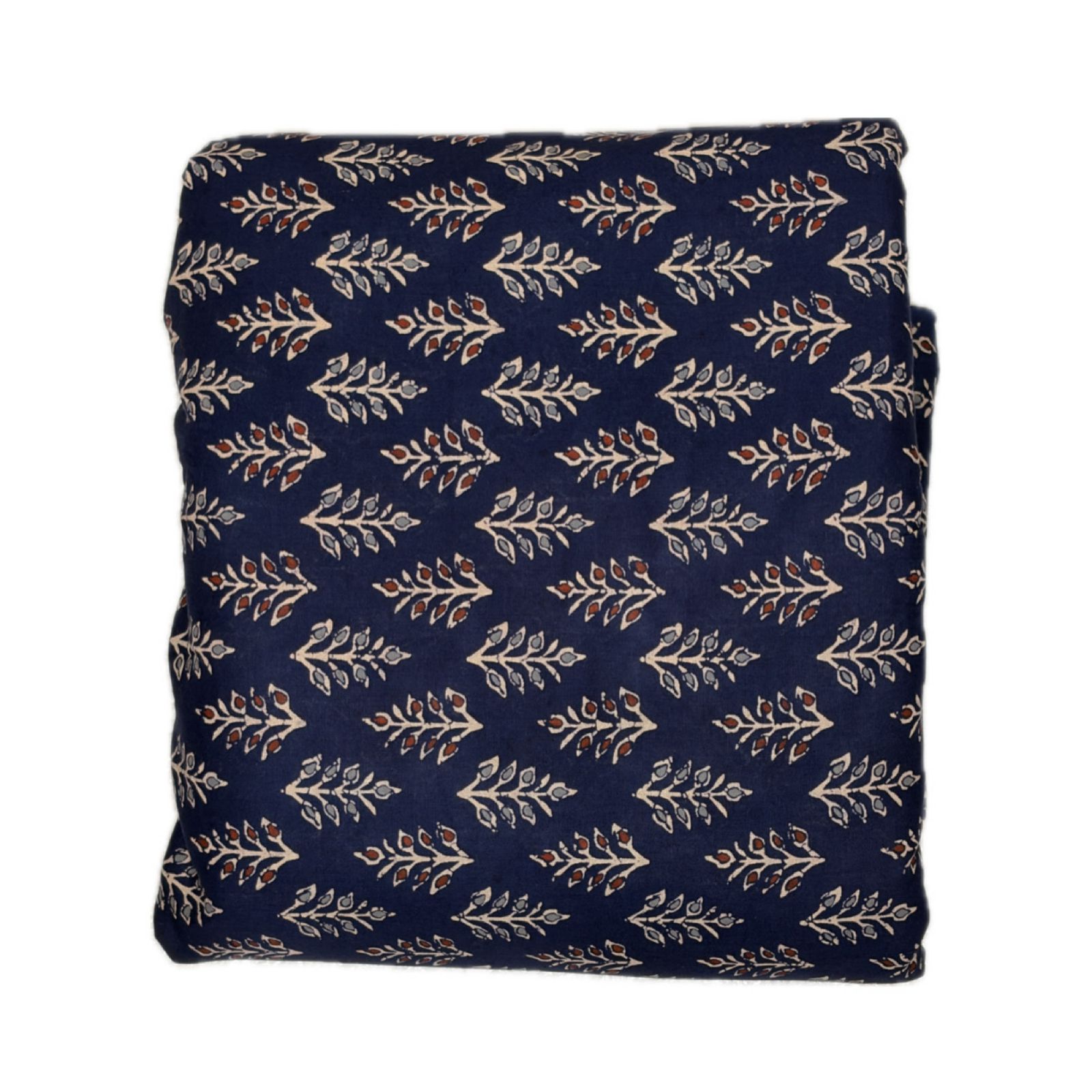 This fabric features a deep indigo base adorned with a traditional buti (small floral/leafy motif) block print.