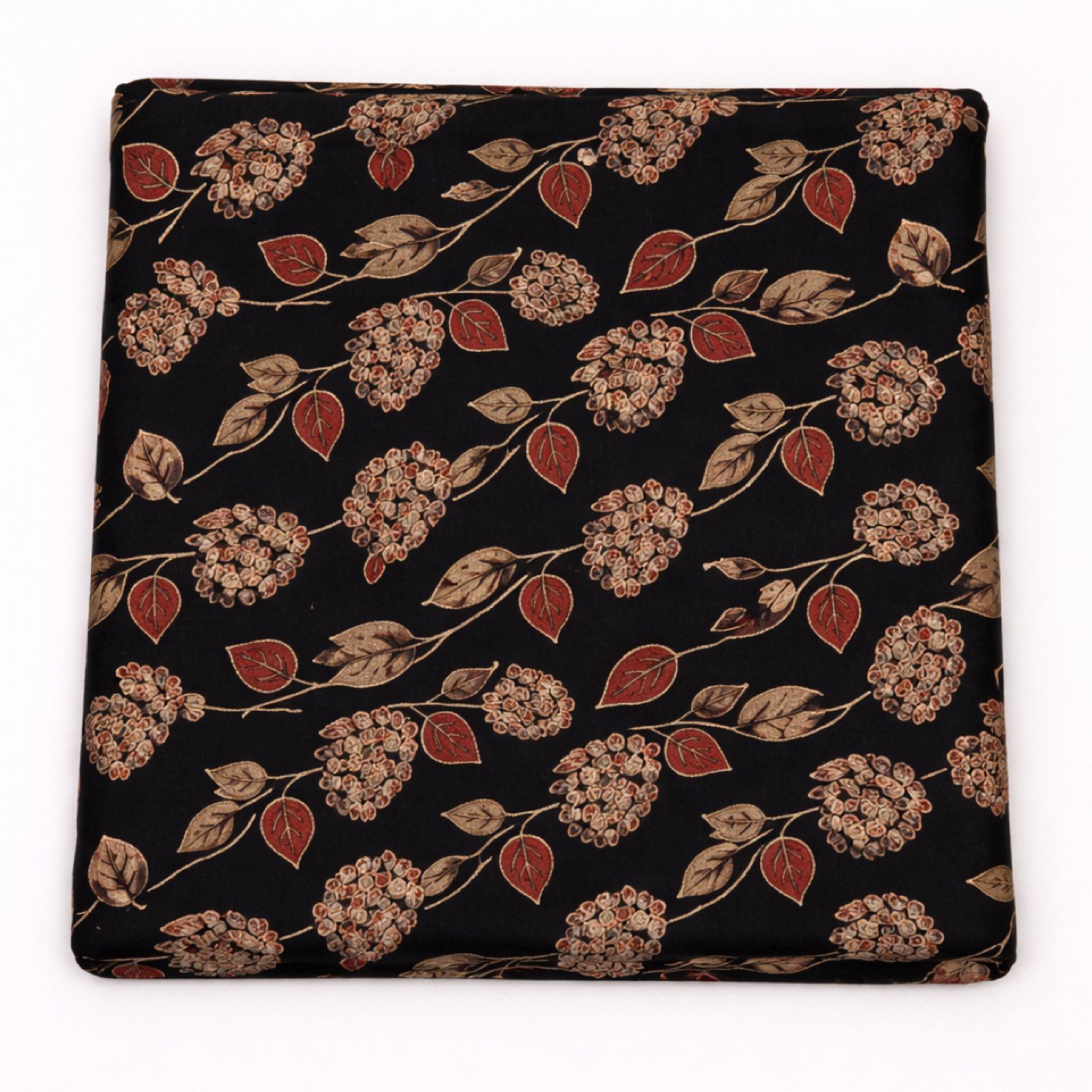 The design consists of delicate clusters of small blossoms paired with stylized leaves in muted beige, soft grey, and earthy red tones, creating a balanced and sophisticated look.