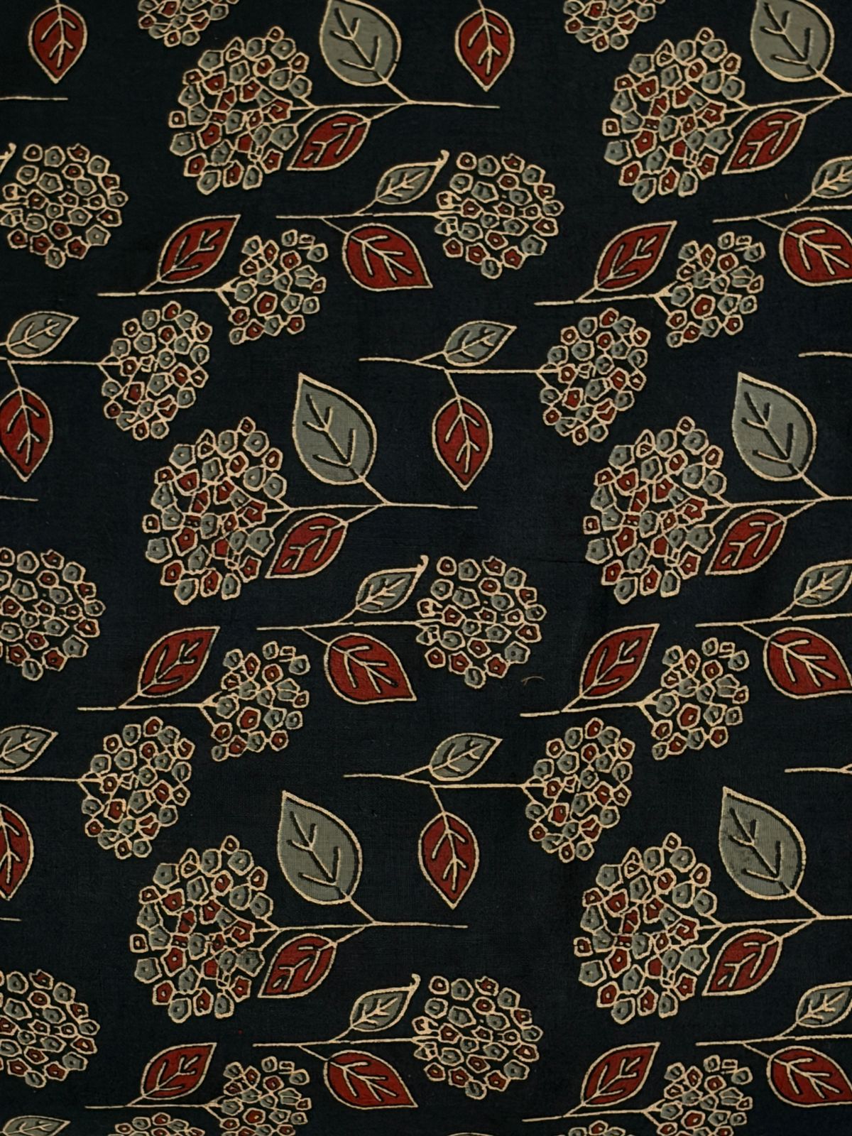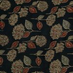 This fabric features a rich dark navy base adorned with an elegant floral and leaf motif