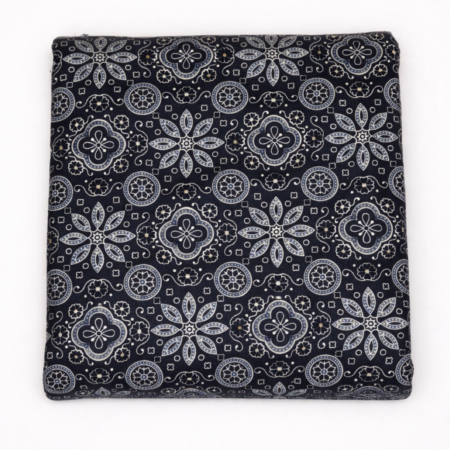 This fabric features a sophisticated ajrakh inspired geometric and floral print traditionally rooted in block-printing techniques