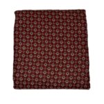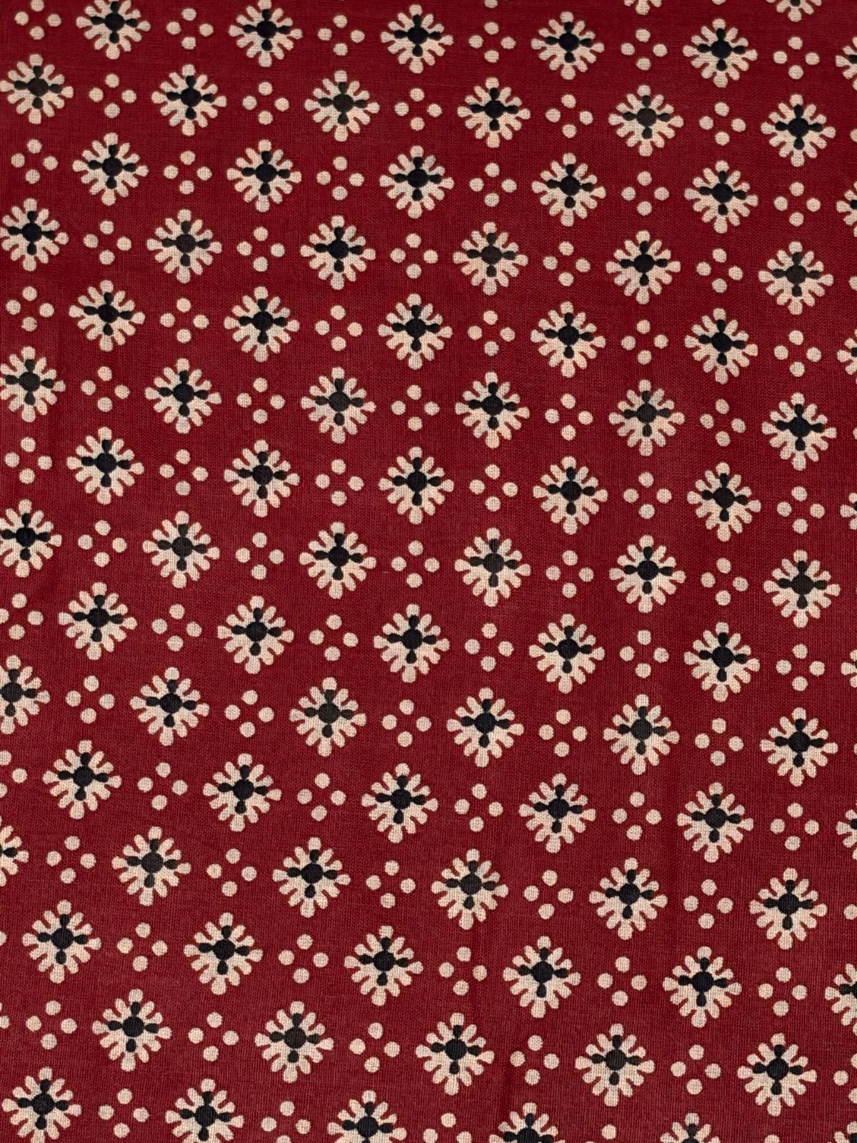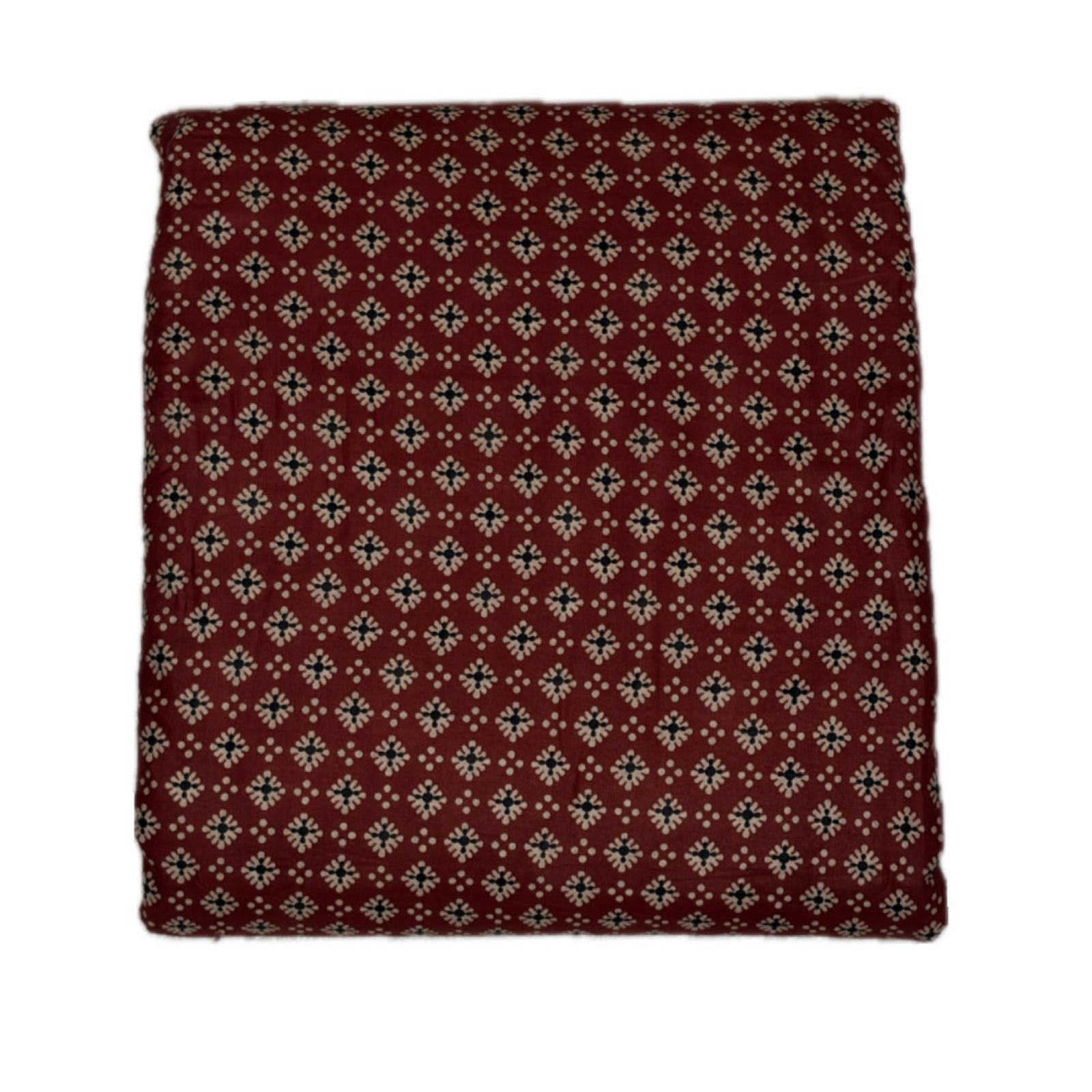 This fabric showcases a rich Madder Red block print, offering a warm and traditional aesthetic with a touch of geometri The design features a delicate, all-over geometric floral Buti. Each motif is composed of a central dark indigo or black core, surrounded by cream-colored petals that form a cross or star-like shape.