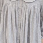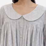 Collar: A prominent, oversized Peter Pan collar with rounded edges, detailed with intricate white floral embroidery and scalloped eyelet cutouts.