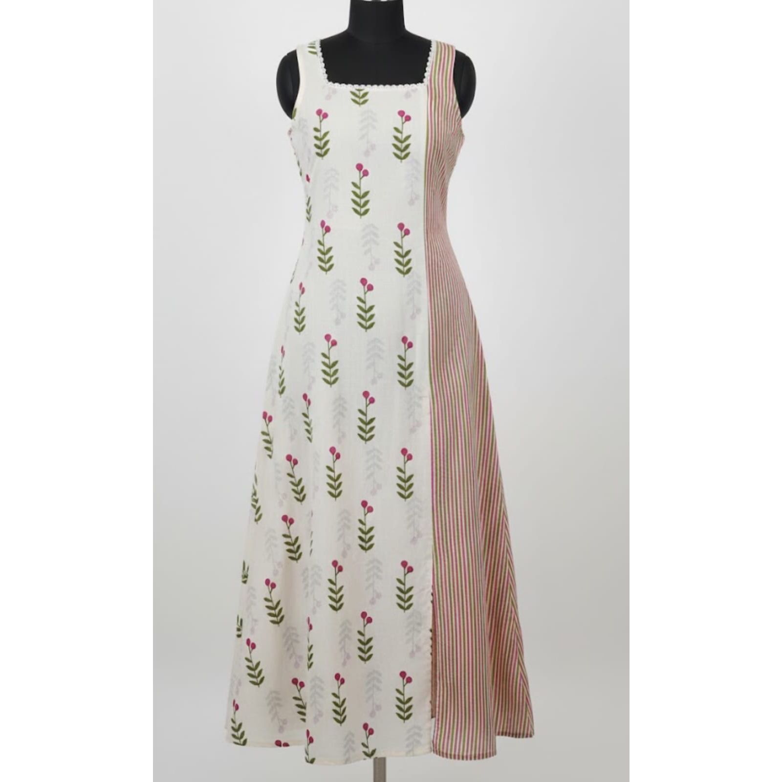 Design Detail: The dress features a unique dual-patterned panel design. The main body is crisp white with vertical floral sprig motifs, while a side panel introduces a contrasting vertical stripe pattern in shades of pink and green.