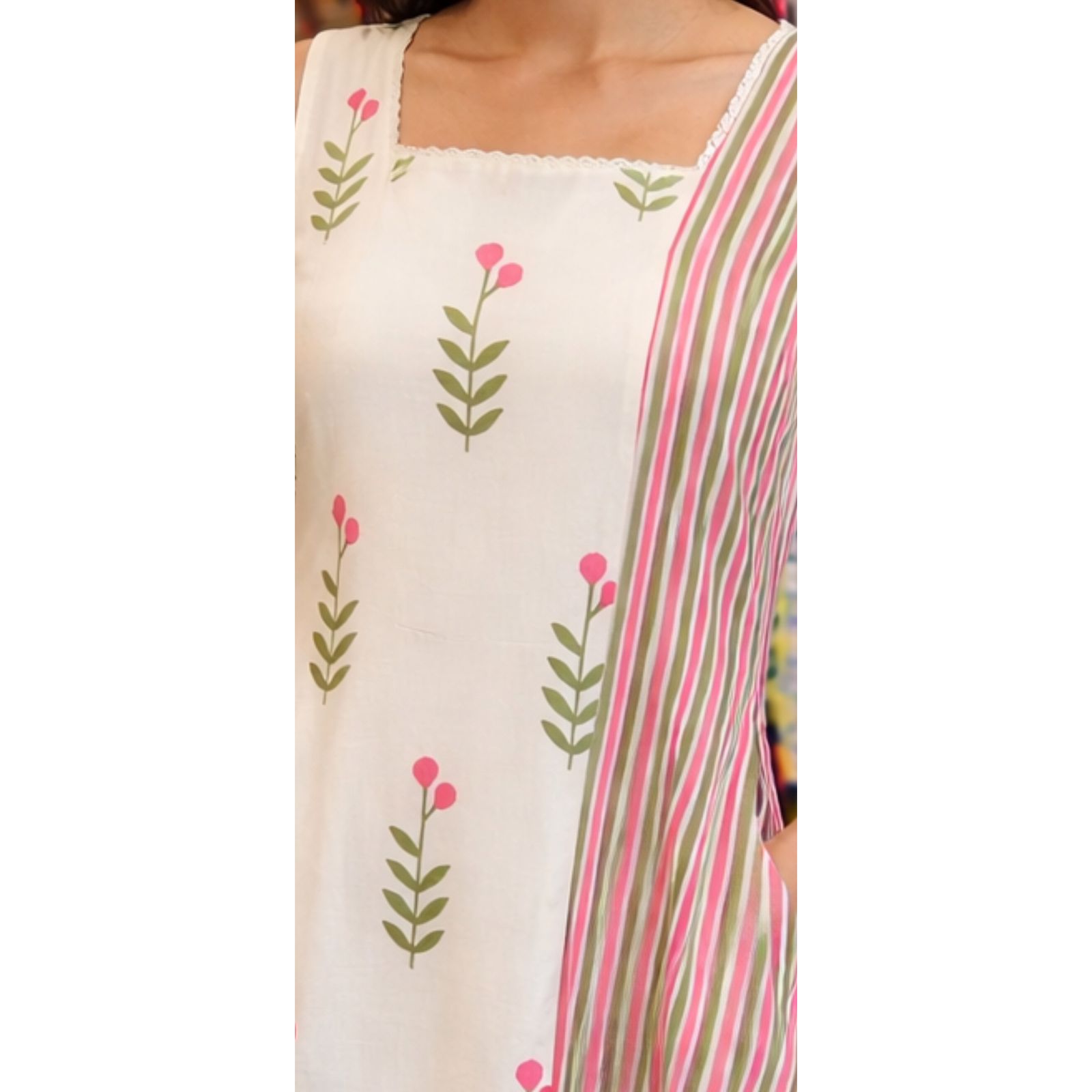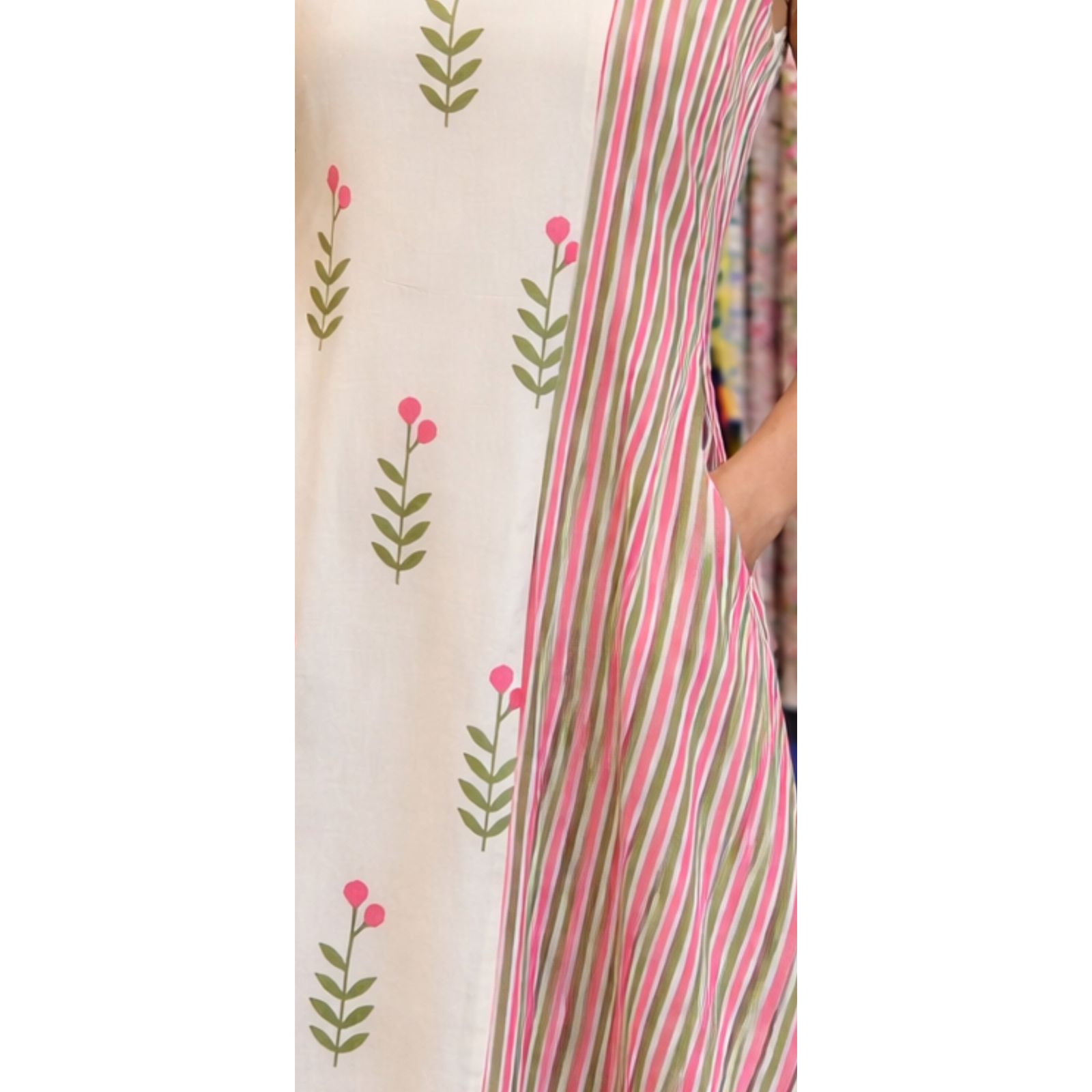 [1:33 pm, 05/04/2026] Diya: Pattern: The “buti” style floral prints in deep pink and olive green give it an artisanal, hand-block-inspired feel.