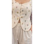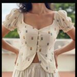 This top features a romantic, cottagecore-inspired aesthetic, combining a structured corset-style bodice with soft, feminine details. It is a perfect blend of vintage charm and modern summer styling.