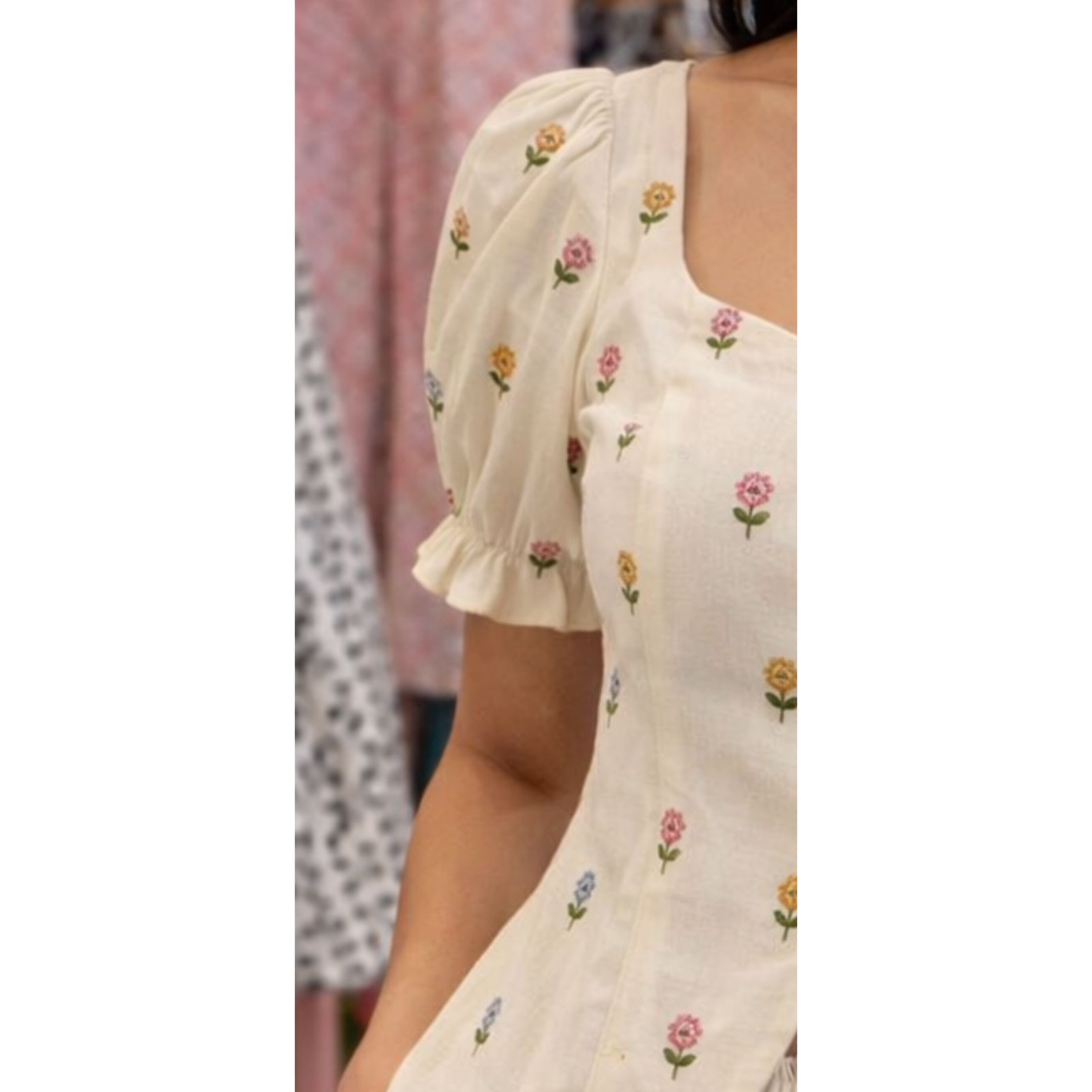 Sleeves: Short, voluminous puff sleeves with elasticized, ruffled cuffs that add a whimsical and airy feel.