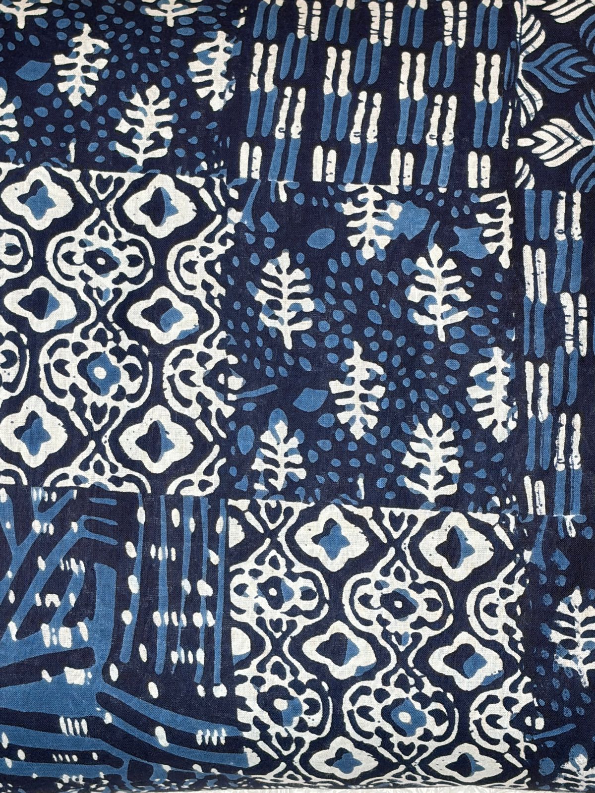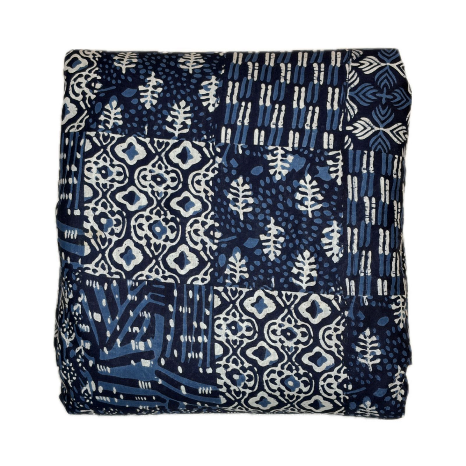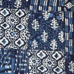 Indigo hand-block printing, featuring a sophisticated patchwork-style layout.