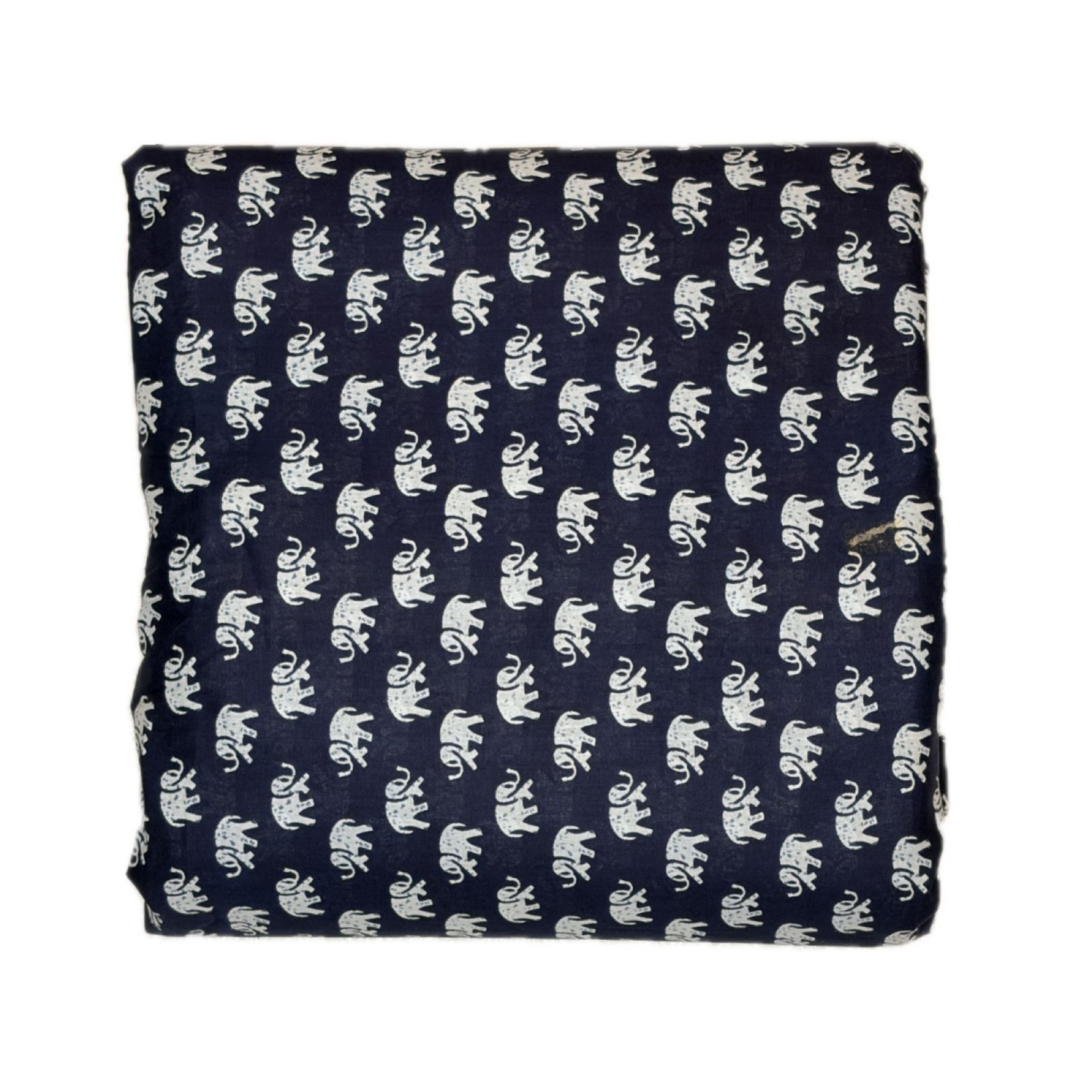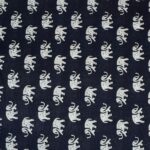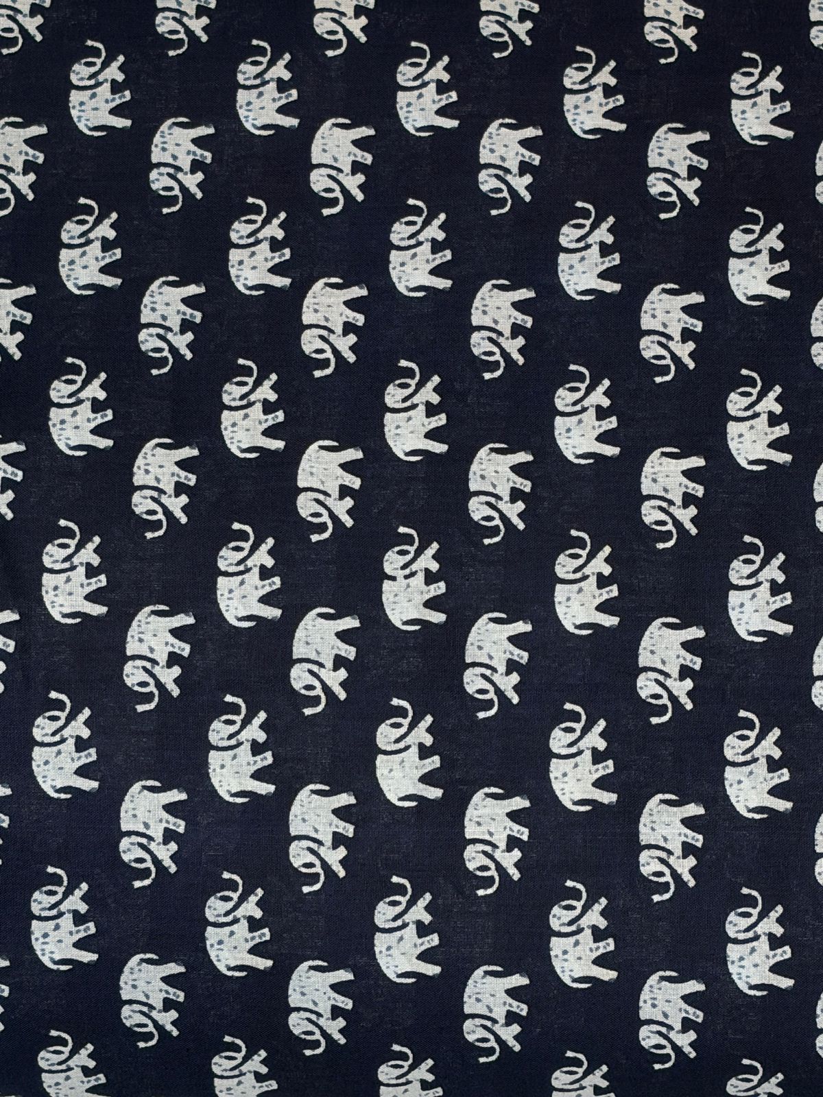This fabric features a deep indigo or navy blue base, adorned with a repeating elephant motif in a crisp, contrasting white Pattern: Whimsical, miniature elephant silhouettes arranged in a structured, diagonal grid.