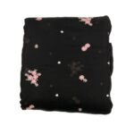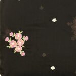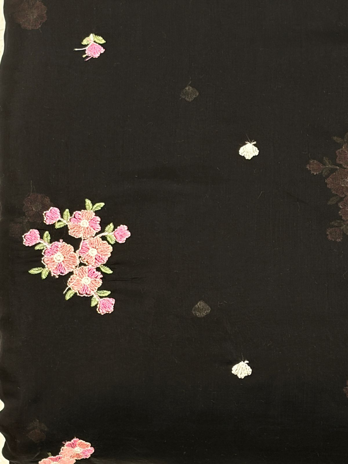 This Mul Chanderi fabric exuded a striking, bold elegance. The deep raven-black base serves as a dramatic backdrop for the delicate floral embroidery