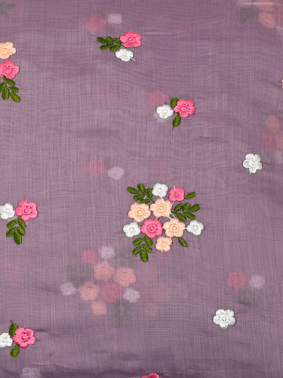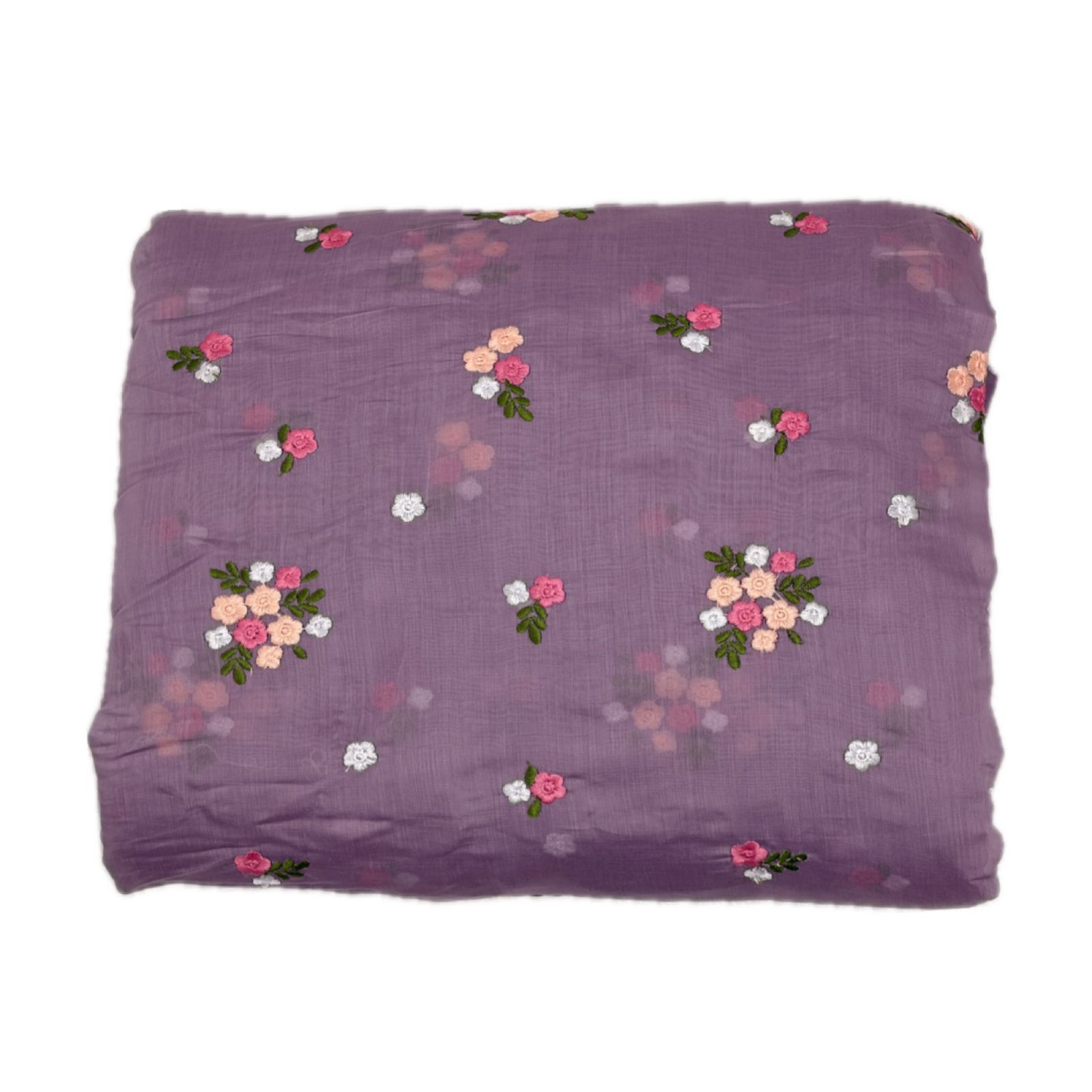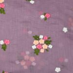 This Mul Chanderi fabric features a refreshing Sage violet base, offering a calm and organic aesthetic. The fabric is beautifully detailed with vibrant floral embroidery