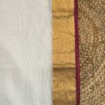 THE base fabric appears to be a high quality mul cotton it has a distinctively fine breathable weave with a soft matte finish that offers a graceful drape .THE off-white ( ivory) body provides a neutral elegant canvas that highlight the metallic and colorful accents