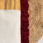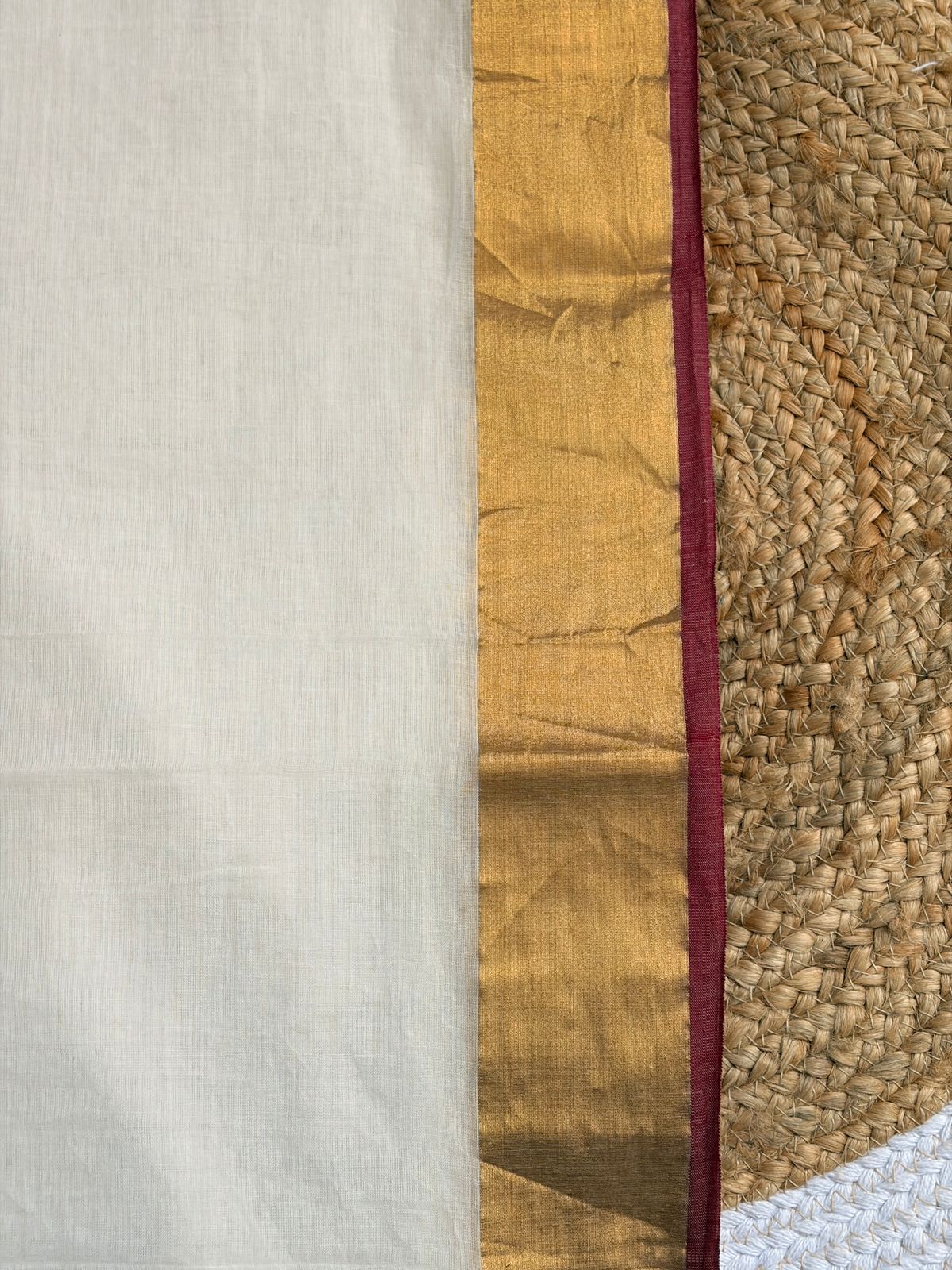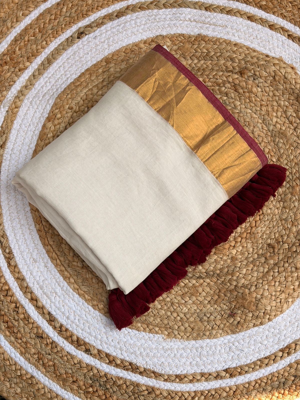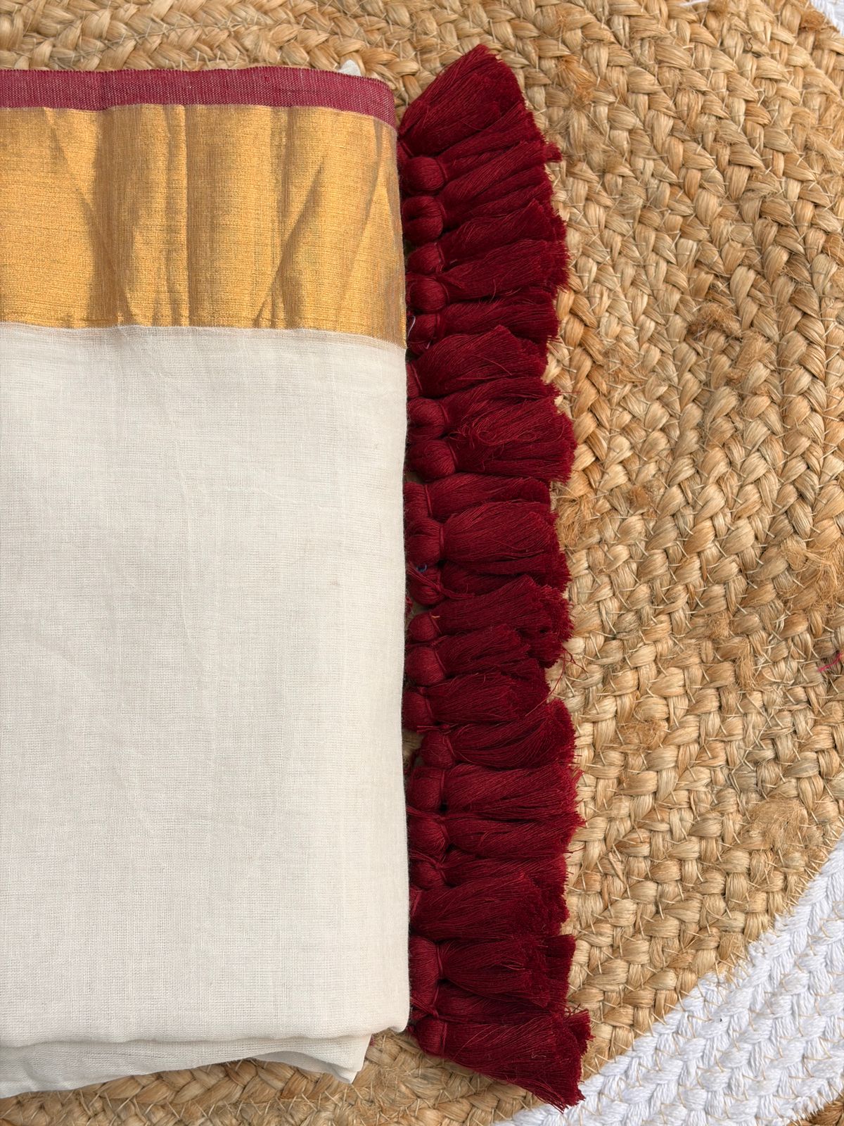 saree border the saree is framed by a rich wide antique gold zari border handmade tasssels one of the standout features is the heavy maroon tassel work along the edge of the pallu